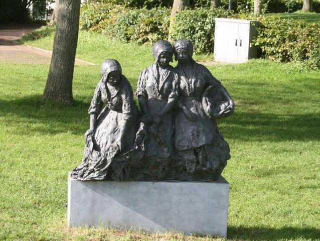 Standbeeld van drie vrouwen die de was doen, bij het witte kerkje in Groet (gemeente Bergen)