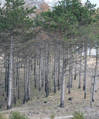 Verbrandde naaldbomen na de brand in 2011