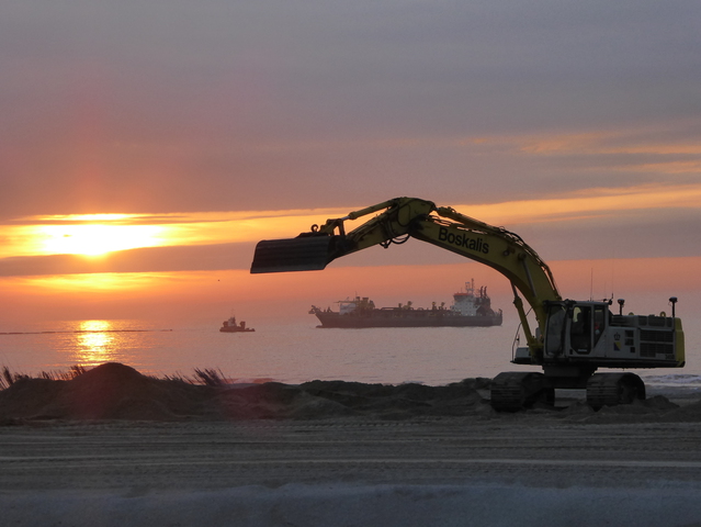Ondergaande zon, tijdens werkzaamheden kust op kracht bij Camperduin. Foto Bungalowpark en Camping Jamarco